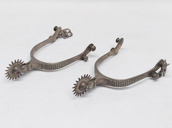 • Par de esporas em alpaca. Marcados EBERLE. Med. 14 x 11 cm.