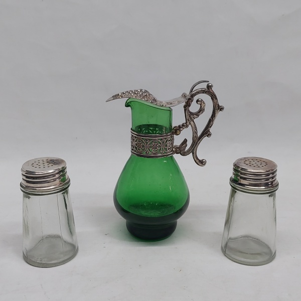 • Três peças para galheteiro em vidro verde, translúcido e metal prateado: A) Recipiente p/azeite em vidro verde, tampa aplicada com cacho de uvas, guarnição vasadas com flores e alça na forma de acantos. Alt. 11 cm. B) Saleiro e pimenteiro translúcido, tampa metálica. Alt. 7 cm.