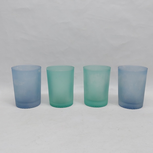 • Quatro copos em vidro verde e azul, decoração satinê. Um com bicado na borda. Alt. 10 cm.