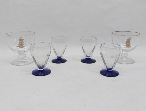 • Seis copos em vidro translúcido: A)  Quatro p/ aperitivo, base redonda em vidro azulão. Alt. 7 cm. B) Duas taças para conhaque, decorada com veleiros em douração. Alt. 9 cm.