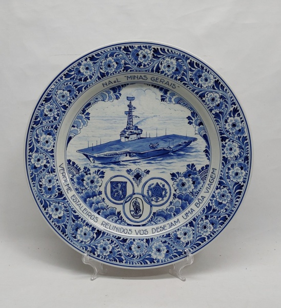 • Prato decorativo em porcelana azul e branca. Borda decorada com flores e acantos, ao centro porta-aviões e brasões militares. Com as inscrições: "NAeL Minas Gerais - Verolme Estaleiros Reunidos vos desejam uma boa viagem". Diam. 35 cm.
