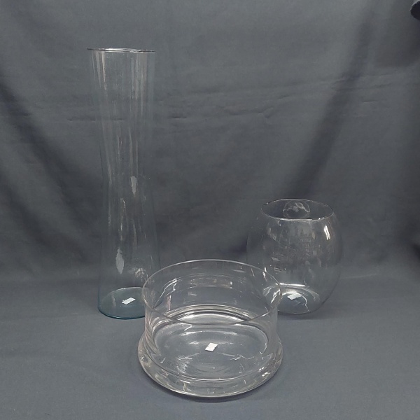 • Três peças em vidro translúcido: A) Duas floreiras, oval e cilíndrica. Alt. 19 e 2 cm. B) centro de mesa redondo. Med. 10 x 20 cm.