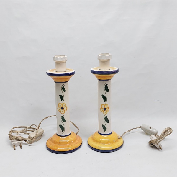 • Par de luminárias de mesa confeccionado em cerâmica vitrificada, haste esmaltada com flor e folhagens. Base e borda com barrado na tonalidade amarela e frisos azuis. Cúpula em pergaminho branco. Alt. Total 38 cm.