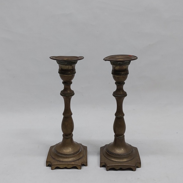 • BRONZE- Par de castiçais em metal amarelo,  haste torneada. Adornado com filetes imitando corda. Bobèche amassada. Alt. 17 cm.