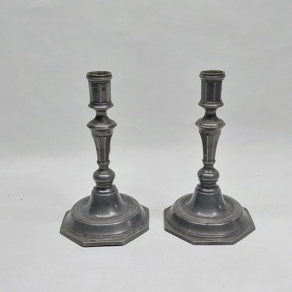 • JOHN SOMERS - Par de castiçais confeccionado em estanho, padrão inglês, haste torneada puncionados JS - MG. Base octogonal. Alt. 20 cm.
