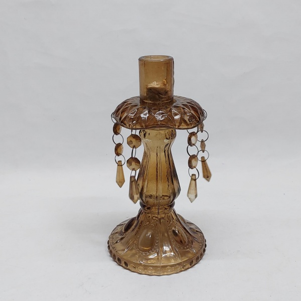 • Gracioso castiçal em vidro na tonalidade âmbar, estilo europeu. Profusamente lapidado com caneluras e motivos. Bobèche ao gosto bico de jaca, 4 argolas com pingentes (falta uma). Alt. 21 cm.