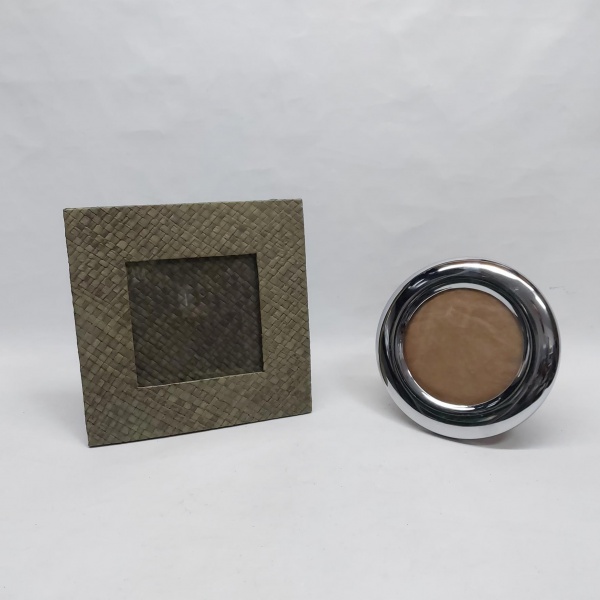 • Dois (2) porta-retratos estilo Art Noveau, sendo: a) Um quadrado confeccionado em palhinha na tonalidade verde. 22 x 22 cm. b) Um redondo confeccionado em metal prateado. Diâm. 17 cm.