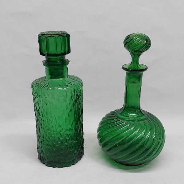 • Licoreira e garrafa para whisky em vidro verde, estilo veneziano. Moldado e lapidado com motivos. Alt. 24 cm.