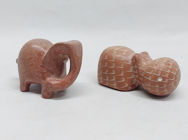• Duas estatuetas confeccionadas em pedra sabão retratando elefante e hipopótamo, adornados com fina linha com formas estilizadas. Comp. 8 cm. (pequeno bicado no hipopótamo).