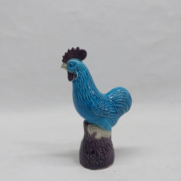 • Tradicional estatueta de galo confeccionado em porcelana na tonalidade azul turquesa. Ao gosto Companhia das Índias. Alt. 16 cm. (bicado no bico).