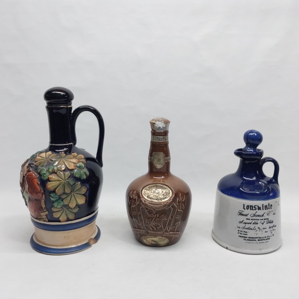• Três garrafas em cerâmica esmaltada, decorações diversas. Maior com a base colada. Alt. 20 a 27 cm.
