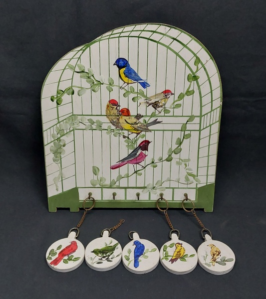 • Porta chaves em madeira com pintura a mão representando gaiola e pássaros. Acompanha cinco chaveiros. 32x 29cm.
