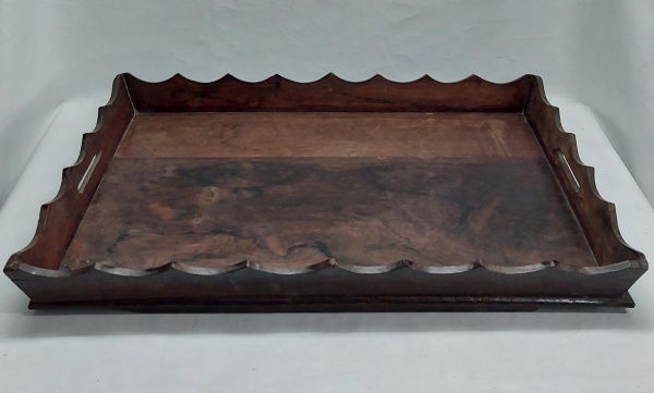 • Bandeja em madeira, bordas recortadas, duas alças. Med. 71 x 47 cm.